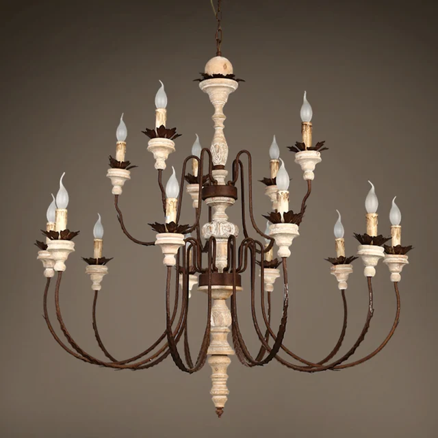 Gaya Amerika Ukiran Kayu Vintage Besi Lampu Gantung Lilin E14 Led